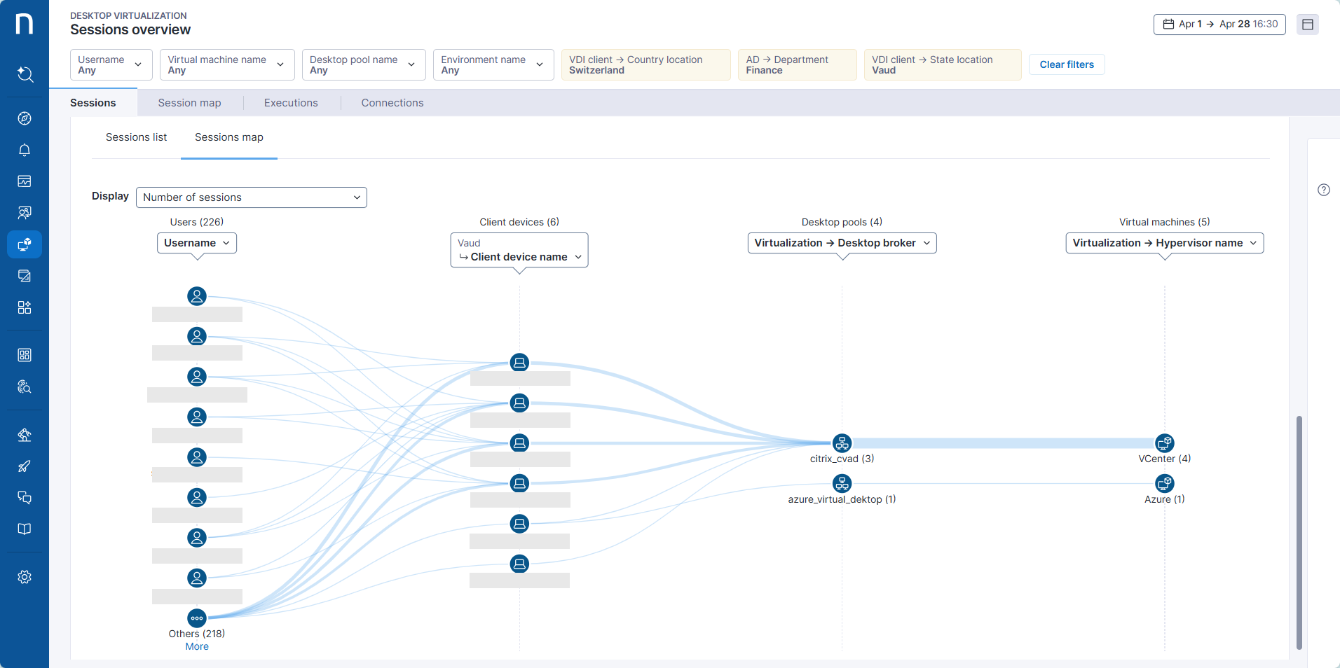 異なるデバイス、ユーザー、および目的地で接続の問題が発生する場合があります。 セッションマップは、session.vdi_eventsデータのインタラクティブな可視化を提供することにより、トラブルシューティングを加速し、ネットワーク関連の問題を修正する適切なチームを特定するのに役立ちます。