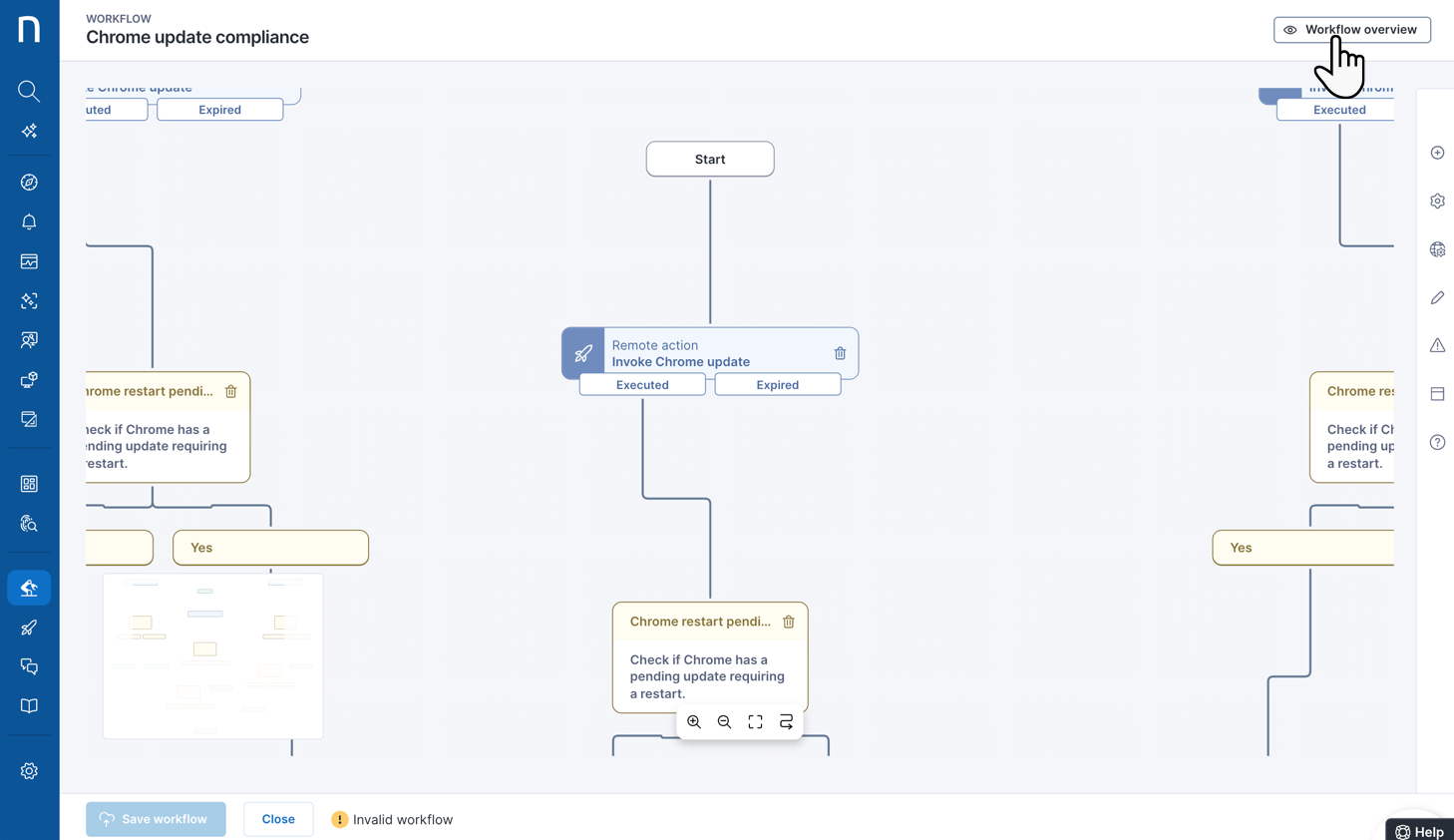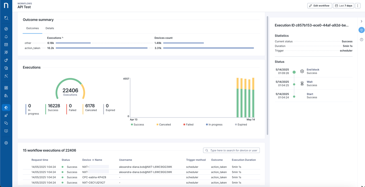 ワークフロー概要ページでは、ITチームにワークフローの実行と結果への可視化を提供します。 ダッシュボードから直接概要結果を表示し、実行の詳細を確認し、問題をトラブルシューティングできます。すべてのトリガーされたワークフローのためにリアルタイムで記録がキャプチャされます。