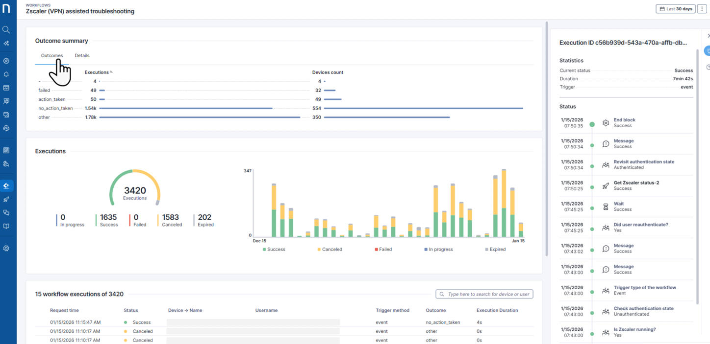 [ワークフローの概要](https://docs.nexthink.com/platform/ja/user-guide/workflows/monitoring-workflows-dashboard/..#troubleshootingworkflows-accessingtheworkflowexecutionspage) ページにアクセスした後、テーブルから項目を選択して、右側のパネルで **ワークフロー実行タイムライン** を開き、ステップバイステップの実行詳細を表示します。