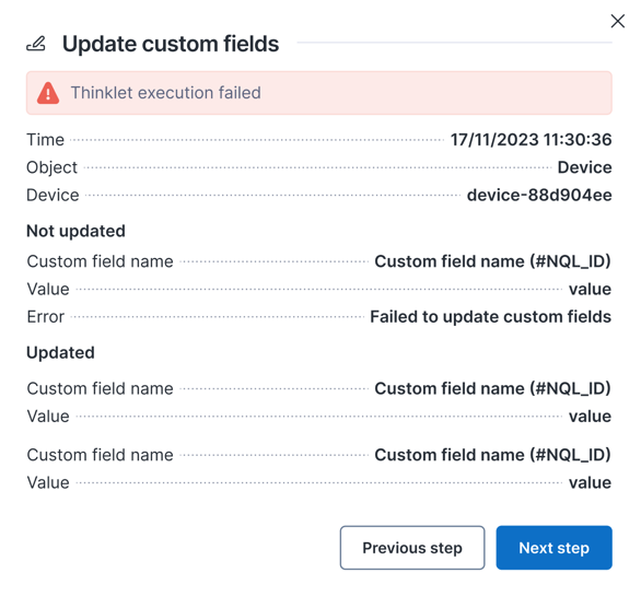 ワークフロー監視のタイムラインで **カスタムフィールドを更新** thinklet の結果を確認する際、次の詳細が利用可能です: