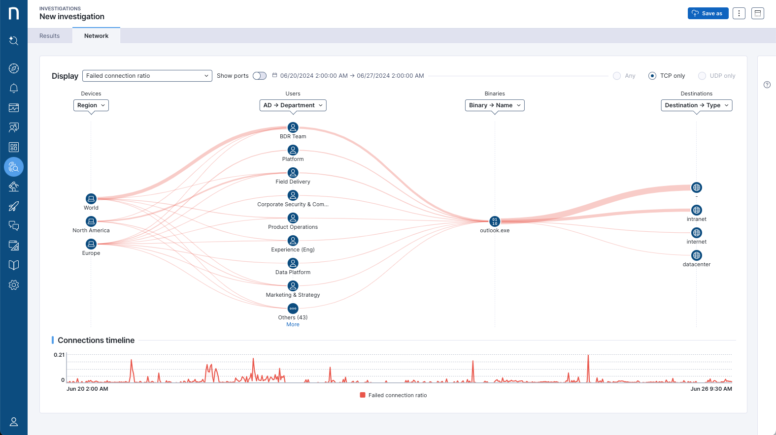 ネットワーク接続の問題がいつ始まったかをより迅速に理解し、接続のトラブルのピークを観察することで、影響を受けている人や考えられる原因を特定します。 ネットワークビューには、選択したメトリックが時間と共にどのように変化するかを示す時系列チャートが表示されます。 詳細については[ネットワークビュー](https://docs.nexthink.com/platform/ja/user-guide/network-view)のドキュメントをご参照ください。