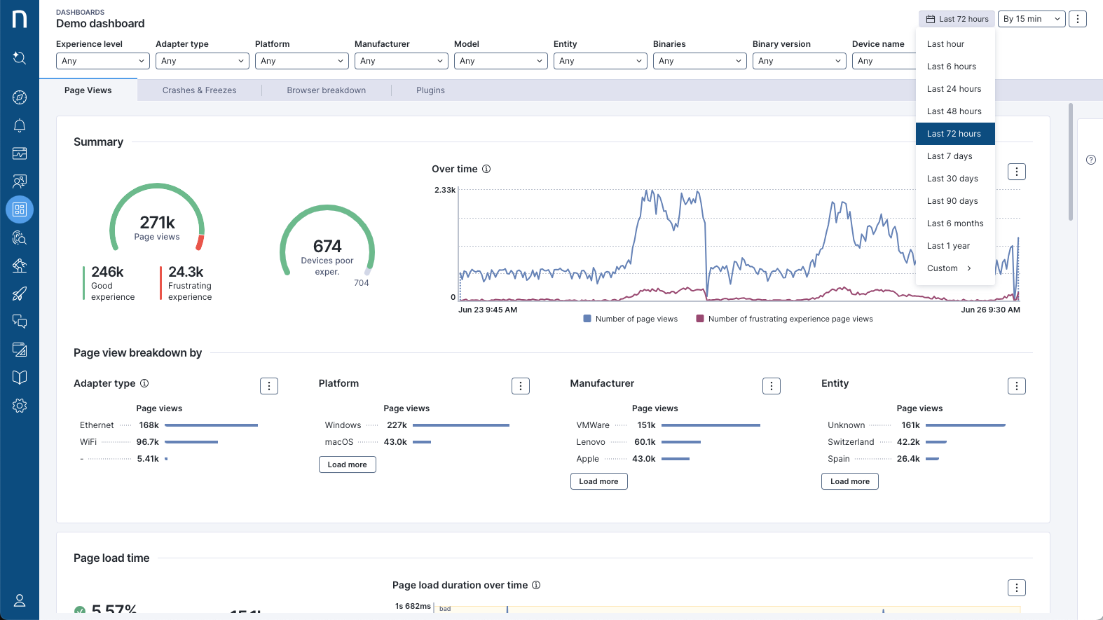 Resolve issues more quickly by honing in on relevant data with two new timeframes in the timeframe picker: last 48 hours, and last 72 hours. Both of these offer 15-minute and 1-hour granularity options. ダッシュボード編集者は、ダッシュボードのデフォルトの時間枠と粒度としてこれらの新しいオプションを選択できるようになりました。