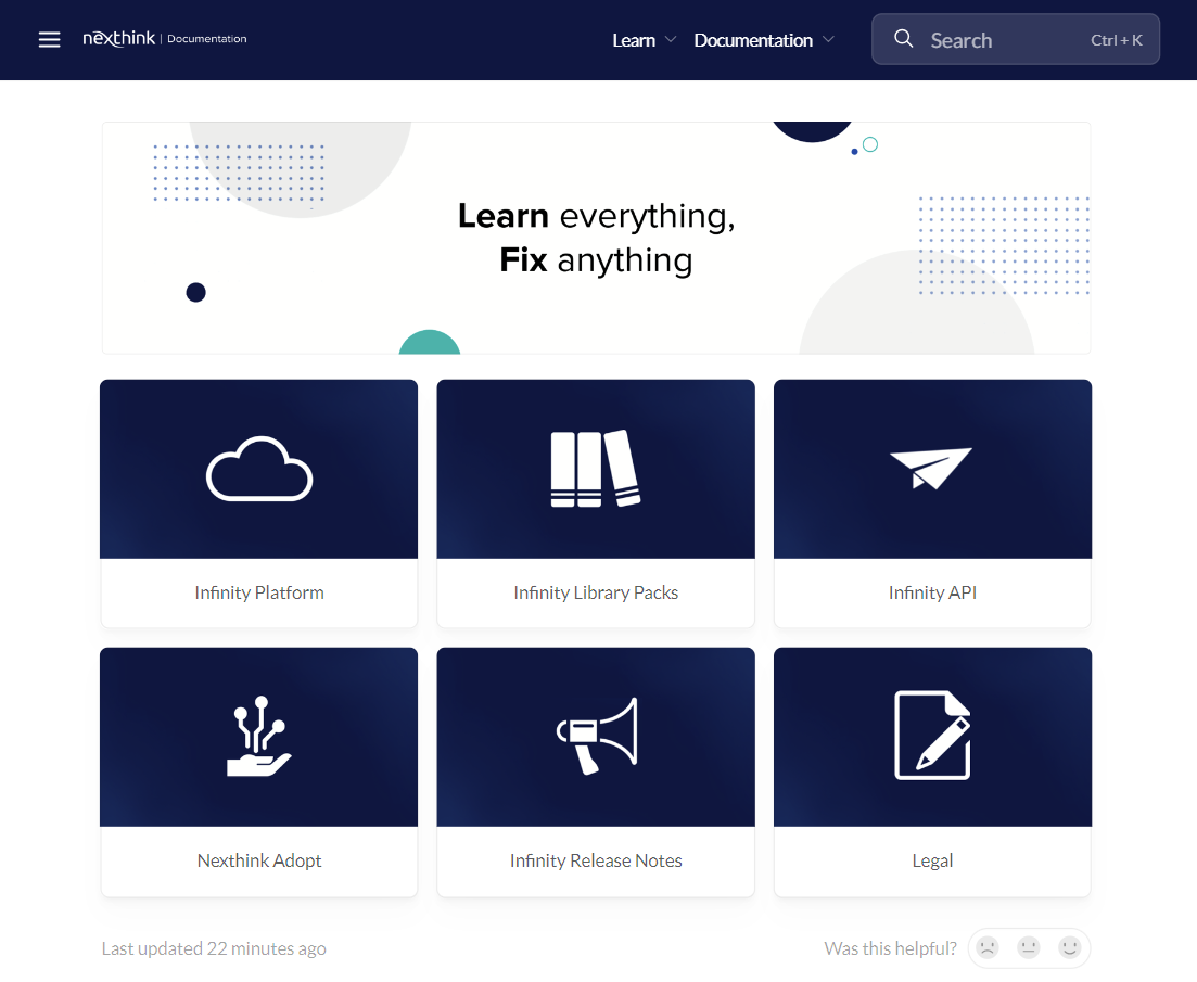 Nexthinkドキュメンテーション- [docs.nexthink.com](http://docs.nexthink.com/) および [edocs.nexthink.com](http://edocs.nexthink.com/) は、いくつかの改善点を備えた新しいプラットフォームに移行されました: 統一されたドキュメンテーションポータルヘッダは、Learnポータルとの調和のとれたナビゲーションを提供し、各ページの最終更新日を表示することができ、ページが役に立つと感じた場合は評価を残すことができます。