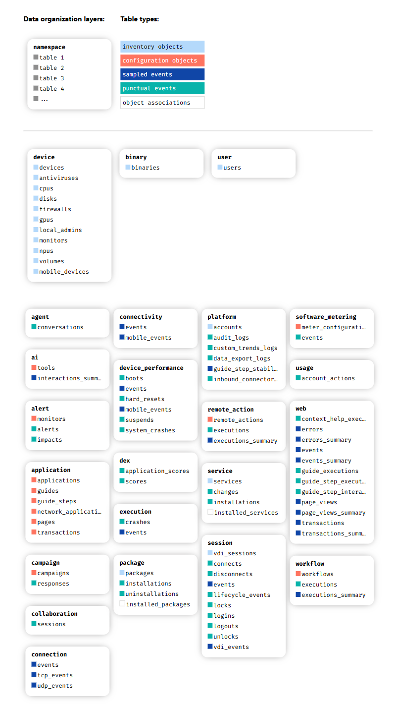 <table data-full-width="true"><thead><tr><th>Table</th><th>Description</th></tr></thead><tbody><tr><td>devices</td><td>Table of devices. A device is a physical or virtual machine monitored by Nexthink Collector.</td></tr><tr><td>device.antiviruses</td><td>The list of antivirus registered on the device and reported through WMI.</td></tr><tr><td>device.cpus</td><td>The list of CPU model names and their nominal clock speeds.</td></tr><tr><td>device.disks</td><td>The list of storage devices.</td></tr><tr><td>device.firewalls</td><td>The list of firewalls registered on the device and exposed through the Windows Security Center.</td></tr><tr><td>device.gpus</td><td>The graphics processing unit.</td></tr><tr><td>device.local_admins</td><td>The list of users and groups that are members of the local Administrators group on the device.</td></tr><tr><td>device.monitors</td><td>The list of monitors connected to the device.</td></tr><tr><td>device.npus</td><td>The neural processing unit.</td></tr><tr><td>device.volumes</td><td>The list of logical storage volumes.</td></tr><tr><td>device.mobile_devices</td><td>Table of mobile devices. A mobile device is a smartphone or tablet monitored by the Nexthink app.</td></tr><tr><td>binaries</td><td>The table containing binaries. A binary is an executable binary file identified by its hash code.</td></tr><tr><td>users</td><td>Table of users. A user is an object that represents an individual user account on a device (local user) or multiple devices (domain user). The user account may identify a physical user or a system user.</td></tr><tr><td>agent.conversations</td><td>The list of conversations with the Spark agent.</td></tr><tr><td>ai.tools</td><td>The table of defined AI tools.</td></tr><tr><td>ai.interactions_summary</td><td>This table collects interactions and usage summary data of the defined AI tools.</td></tr><tr><td>alert.monitors</td><td>The table of defined alert monitors in the system.</td></tr><tr><td>alerts</td><td>The table collecting information about instances where metric values go outside normal parameters as defined in monitors.</td></tr><tr><td>alert.impacts</td><td>The table collecting information about instances of an alert impact.</td></tr><tr><td>applications</td><td>Table of defined Web and Desktop applications.</td></tr><tr><td>application.guides</td><td>A guide represents any type of in-app guidance for end-users, including Walkthroughs (step-by-step guidance), Tooltips, and Media (PDFs, links, etc).</td></tr><tr><td>application.guide_steps</td><td>A step represents an individual part of a walkthrough, tooltip, or document.</td></tr><tr><td>application.network_applications</td><td>Table of defined network applications.</td></tr><tr><td>application.pages</td><td>Table of defined key pages.</td></tr><tr><td>application.transactions</td><td>Table of defined transactions.</td></tr><tr><td>campaigns</td><td>The table collecting all active and retired campaigns.</td></tr><tr><td>campaign.responses</td><td>The table collecting responses (expected or given) of a campaign by an employee.</td></tr><tr><td>collaboration.sessions</td><td>Table collecting meetings performed with collaboration tools such as Teams or Zoom.</td></tr><tr><td>connection.events</td><td>The connections.events table contains events for outgoing TCP connections and UDP packages. Some metrics are only available for TCP connections. These metrics are 'NULL' for UDP events. Connection events are associated to binaries, users, devices, and applications (optional).</td></tr><tr><td>connection.tcp_events</td><td>The connections.tcp_events table has been deprecated. Please use 'connection.events' table instead.</td></tr><tr><td>connection.udp_events</td><td>The connections.udp_events table has been deprecated. Please use 'connection.events' table instead.</td></tr><tr><td>connectivity.events</td><td>Table collecting performance metrics and attributes specific to a device's connectivity.</td></tr><tr><td>connectivity.mobile_events</td><td>The table collecting connectivity metrics and attributes specific to a device.</td></tr><tr><td>device_performance.boots</td><td>The table collecting all exit-from-inactive events of a device.</td></tr><tr><td>device_performance.events</td><td>The table collecting performance metrics and attributes specific to a device.</td></tr><tr><td>device_performance.hard_resets</td><td>The table contains hard resets, when a device reboots without first completing the shutdown procedure. For example, when a device unresponsive and must be powered off manually, or during unexpexted power loss.</td></tr><tr><td>device_performance.mobile_events</td><td>The table collecting performance metrics and attributes specific to a mobile device.</td></tr><tr><td>device_performance.suspends</td><td>The table collecting all transition-to-inactive events of a device.</td></tr><tr><td>device_performance.system_crashes</td><td>The table collecting the system crashes of the devices.</td></tr><tr><td>dex.application_scores</td><td>application_score</td></tr><tr><td>dex.scores</td><td>A table of the DEX score.</td></tr><tr><td>execution.crashes</td><td>The table collecting crashes of a running process.</td></tr><tr><td>execution.events</td><td>The table collecting performance metrics and attributes specific to a process execution.</td></tr><tr><td>packages</td><td>The table of packages. A package is a group of files and executables that together constitute a software application.</td></tr><tr><td>package.installations</td><td>The table of package installation events.</td></tr><tr><td>package.uninstallations</td><td>The table of package uninstallation events.</td></tr><tr><td>package.installed_packages</td><td>The table of all installed packages on all devices.</td></tr><tr><td>platform.accounts</td><td>account</td></tr><tr><td>platform.audit_logs</td><td>The list of all the events audited on the Infinity platform. Requires permission 'View audit logs in NQL'</td></tr><tr><td>pla