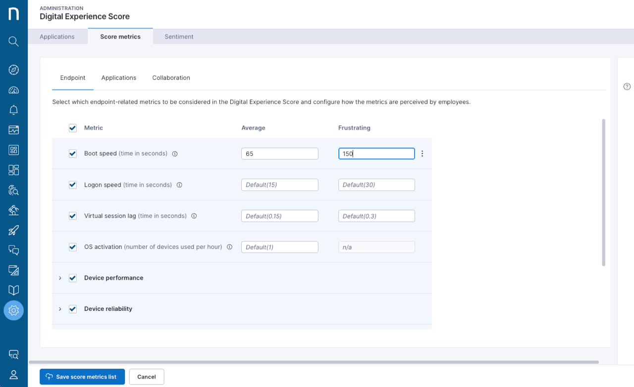 From the **Score metrics** tab on the Digital Experience Score configuration page, configure the **Average** and **Frustrating** thresholds of experience computation for each score metric: