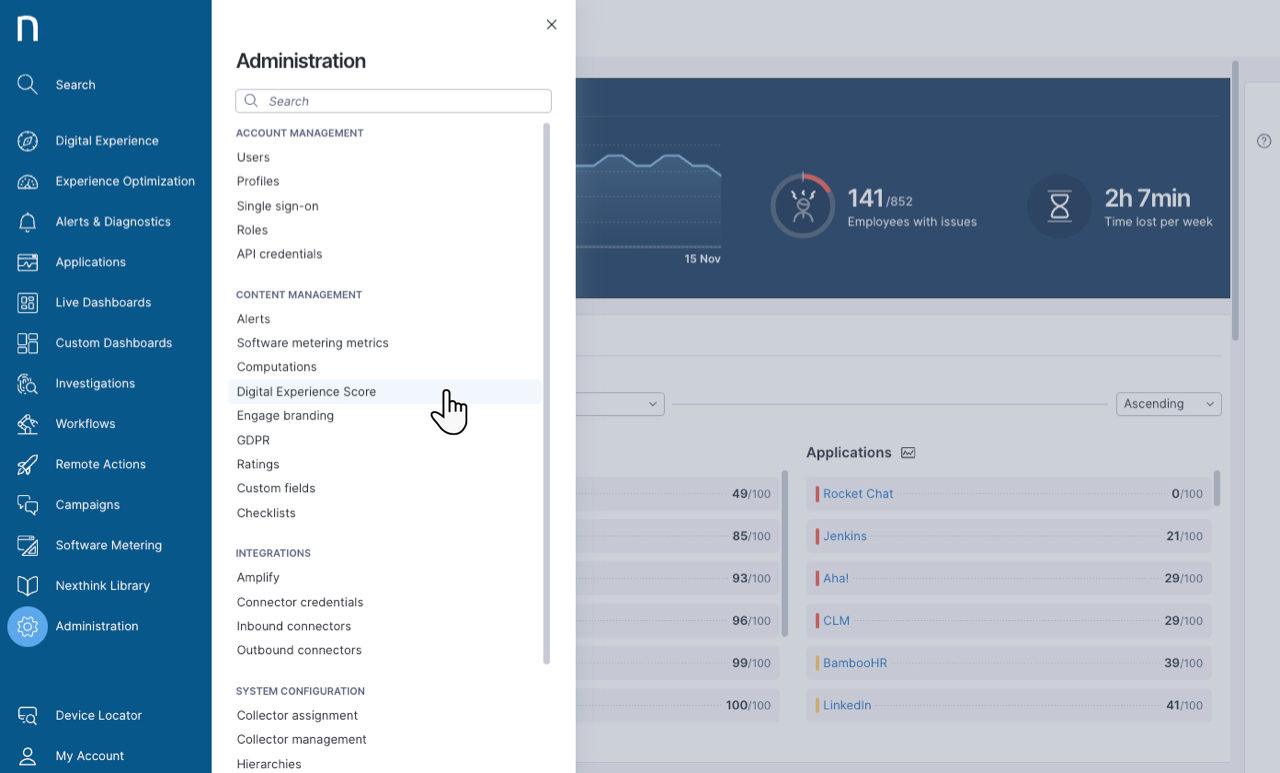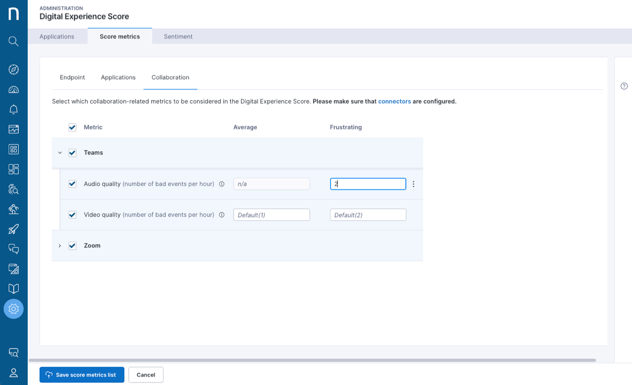 If you can access Nexthink connectors for Microsoft Teams or Zoom, you can feed data from these applications into the DEX score: