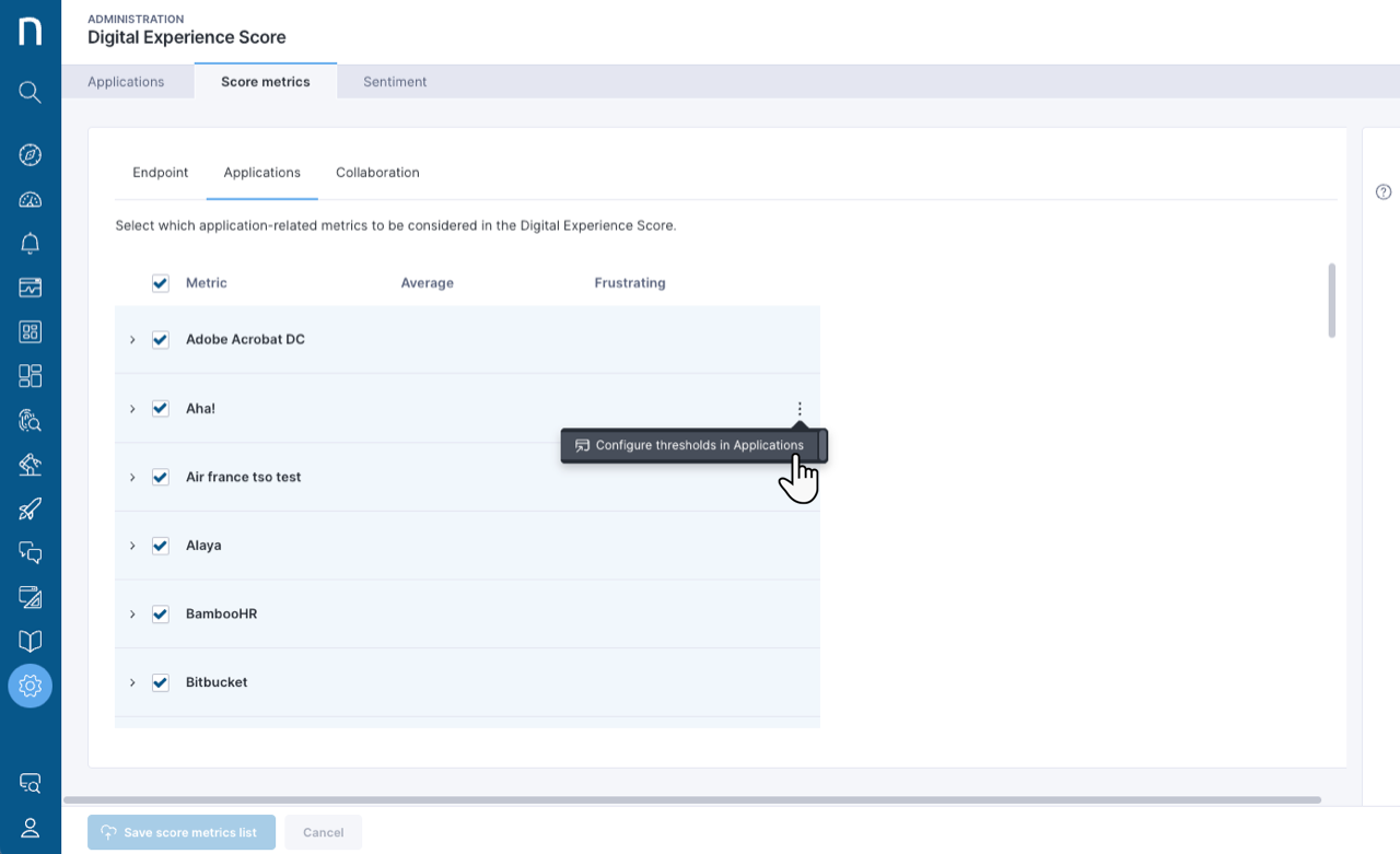 From the **Applications** tab on the Digital Experience Score configuration page: