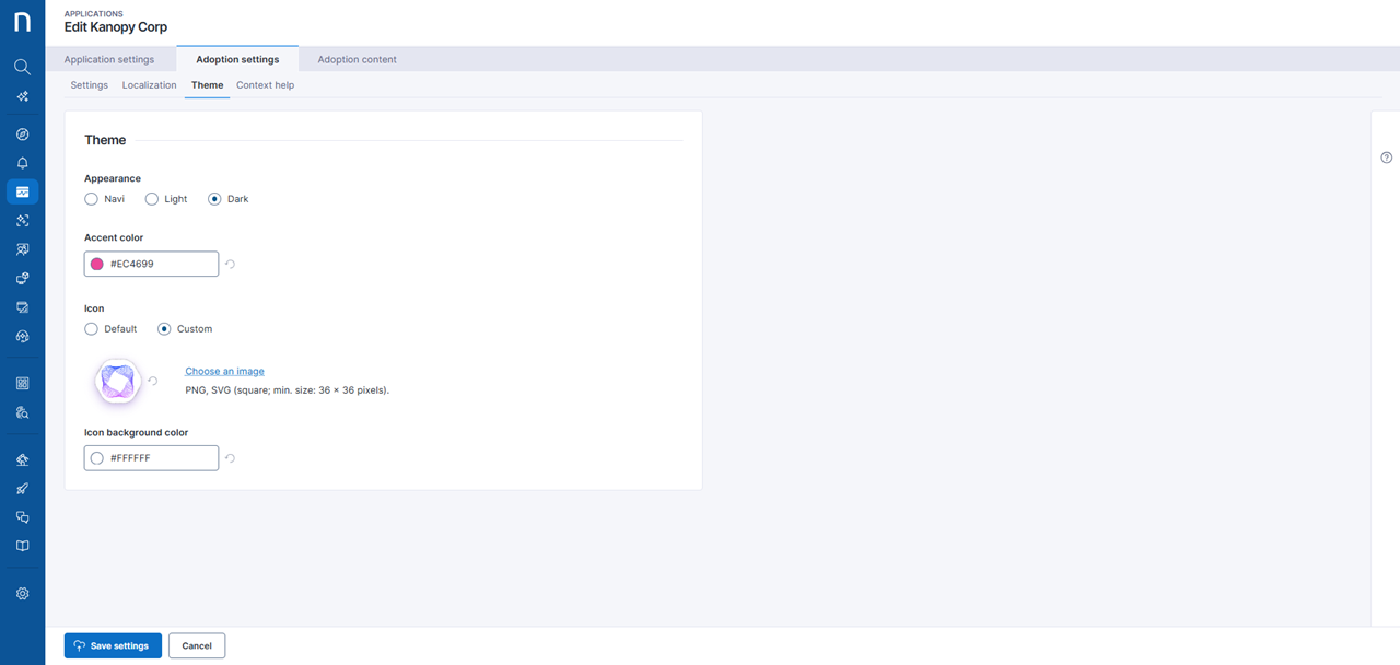 3. Under **Adoption settings** > **Theme** tab, choose a background color for the icon using a HEX code. For example: `#1046a8`
