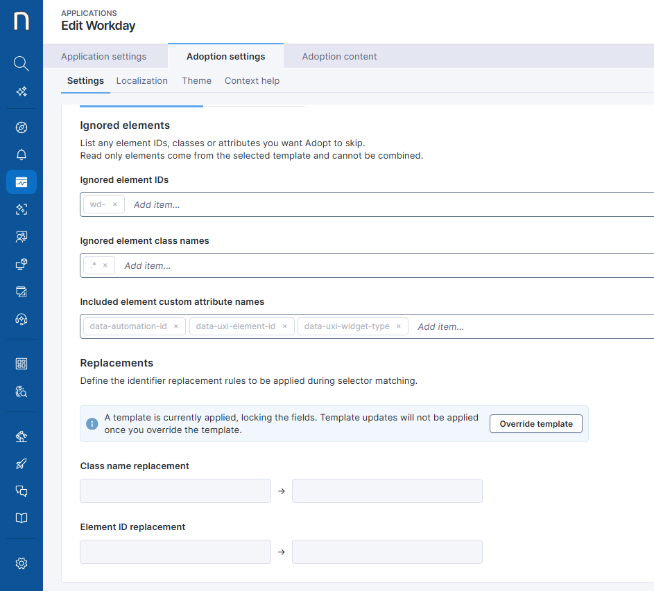Fill in the following **Element selector** fields to avoid instability when [capturing elements in Adopt Editor](https://docs.nexthink.com/platform/user-guide/adopt/guide-content-development-from-in-app-adopt-editor/using-element-selector-in-adopt-editor). Element selectors are case-by-case, as some websites have more complex designs than others.