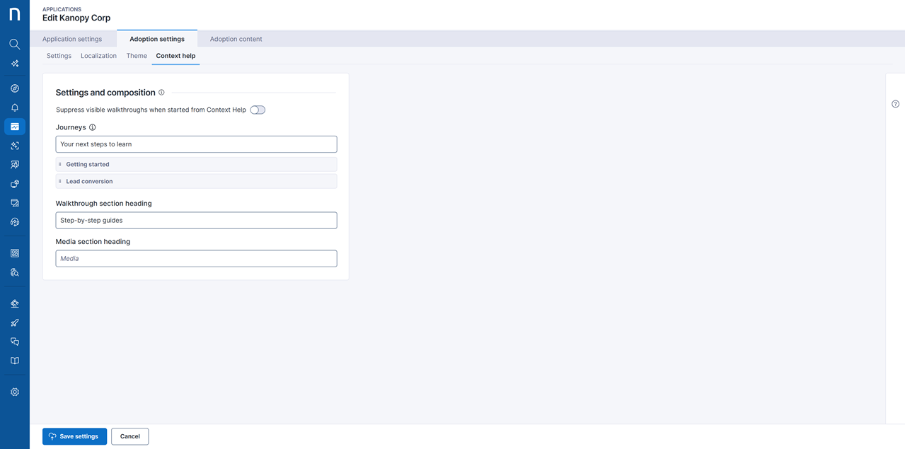 **Adoption Settings** allow you to set default behaviors for all guides within a web application. This includes element selectors and guide component setups that shape content development in Adopt Editor. In addition, you can also select default options for displaying **Context help**.