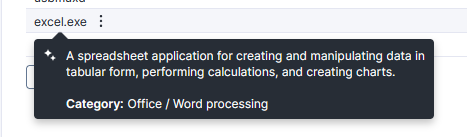 Hover over named binaries displayed in [Live Dashboards](https://docs.nexthink.com/platform/user-guide/using-live-dashboards#usinglivedashboards-usingdashboardwidgets) table-type widgets to obtain an AI-generated description of specific binaries.